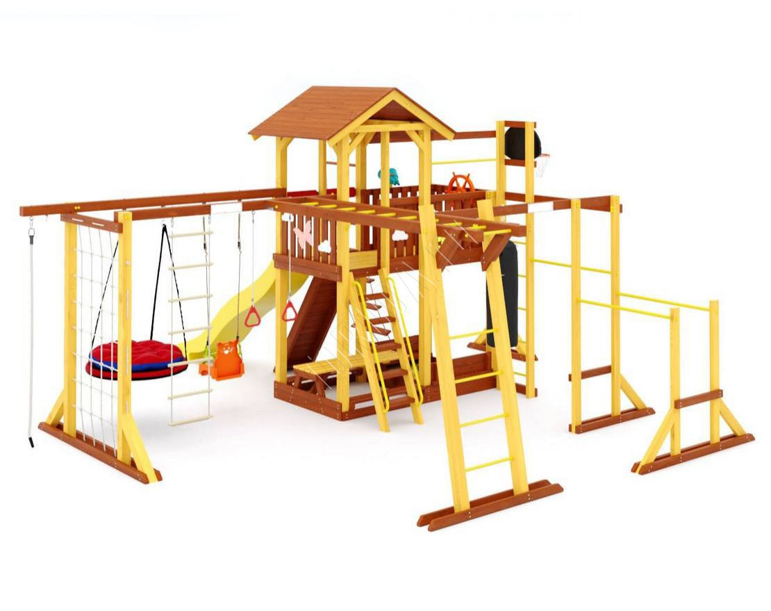 - Многообразие игровых элементов: в комплектацию входят скалодром, сетка-лазалка, турники, гимнастические кольца, песочница с крышкой, которая трансформируется в две лавочки, и многое другое.
