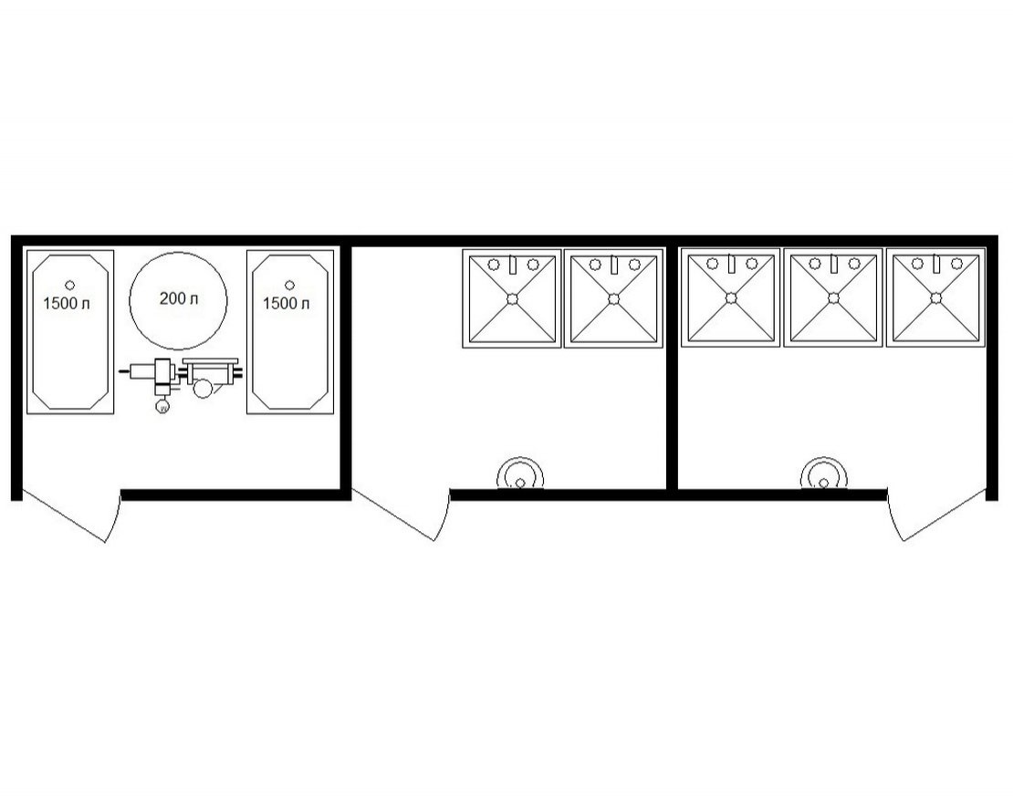 Автономность работы душевого блок-контейнера обеспечивают две ёмкости – бак для воды (от 300 до 48000 л) и канализационный бок для стоков, который по объему так же может быть от 300 до 48000 литров. Подача воды в душ и отведение канализации из душевого блок-контейнера осуществляется при помощи двух насосов: станции подачи воды и санитарного насоса (сантехнический насос с измельчителем).