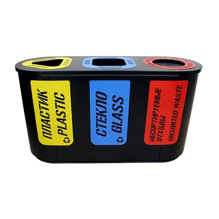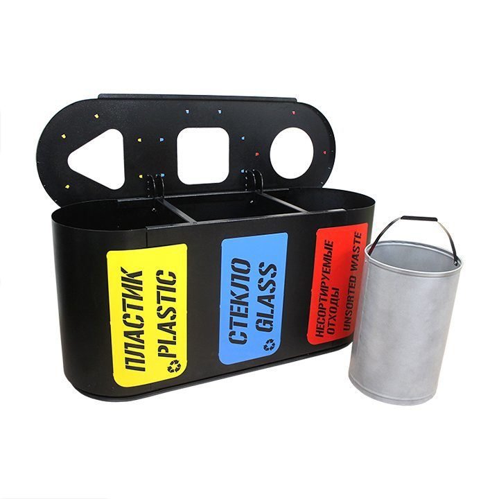 В стандартную комплектацию каждой секции входит: внутренний стальной бак с удобной ручкой, металлическая накладка с указанием вида собираемого мусора, окрашенная в жёлтый (пластик), красный (несортируемые отходы) или синий (стекло) цвет.