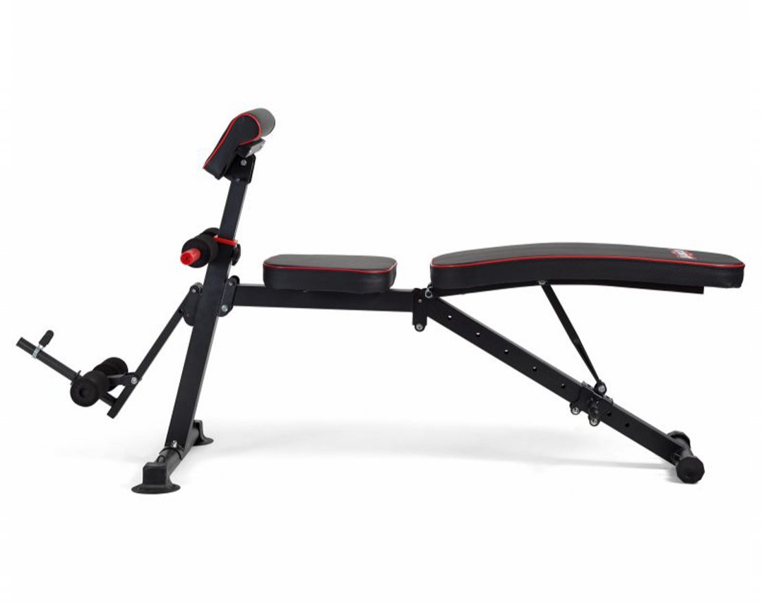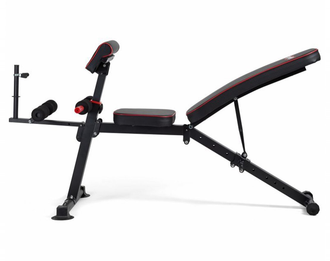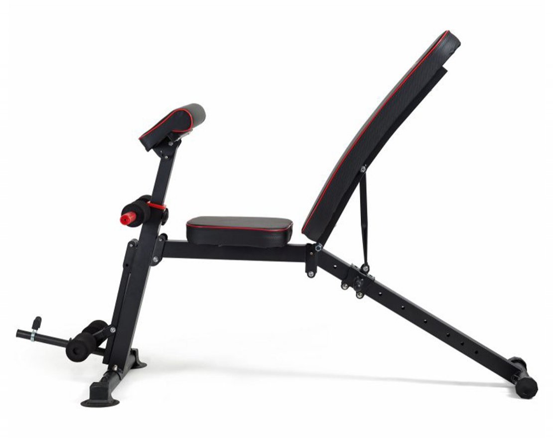 Многофункциональная скамья VictoryFit VF-T21. Предназначена для тренировки мышц пресса, рук, ног, спины. В комплект поставки входят 2 эспандера, которые крепятся к основанию тренажера. У скамьи регулируемая спинка, широкий выбор угла наклона, вплоть до отрицательного. По высоте регулируется подставка для рук, помимо этого регулируется угол ее наклона. С помощью дополнительных блинов для штанги (в комплект поставки не входят) можно создать дополнительное отягощение для тренировки ног. Толщина стали 1.5 мм.