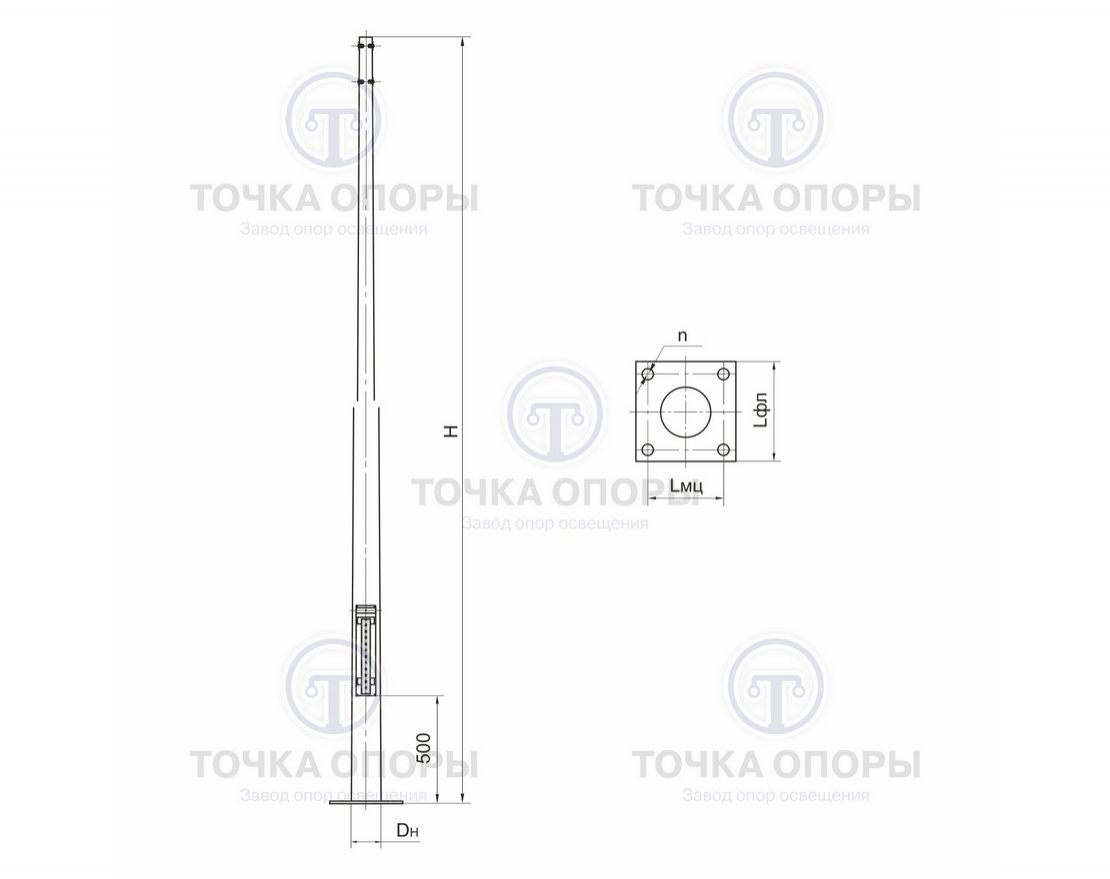 Подвод питающего кабеля допустим только подземным способом, обслуживание происходит через специальный лючок, расположенный в нижней части опоры.